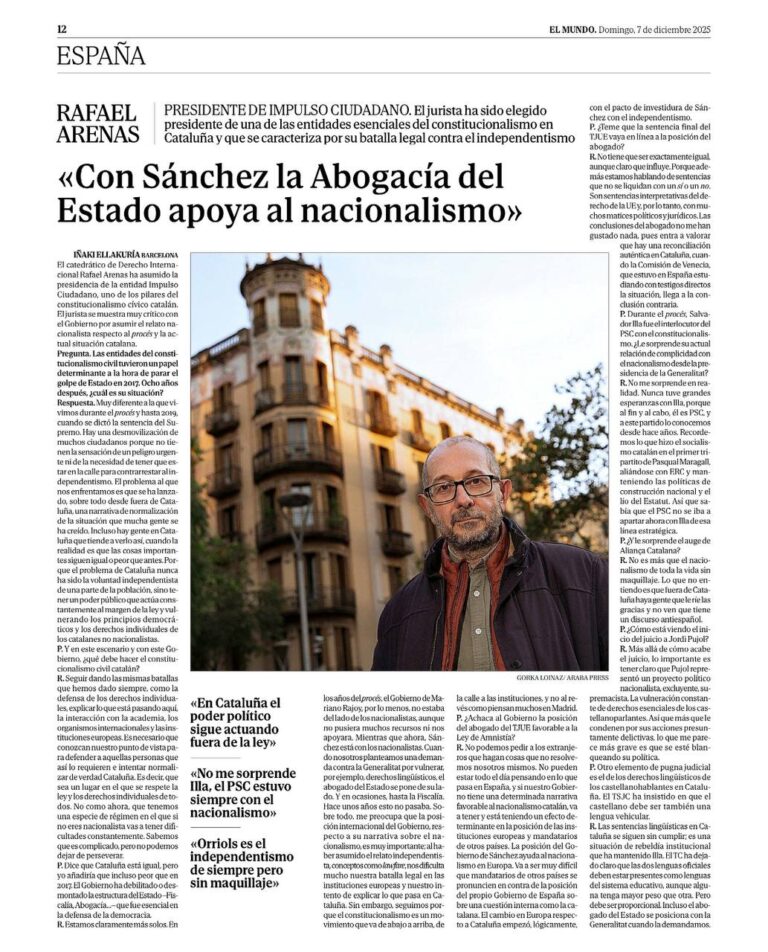 El nuevo presidente de Impulso Ciudadano, el Catedrático de Derecho Internacional Privado, Rafael Arenas, responde en una interesante entrevista realizada por Iñaki Ellakurria, a la situación existente en la actualidad en Cataluña, mostrando su preocupación por que el estado de derecho siga incumpliéndose y, lo más preocupante; «Con Sánchez la Abogacía del Estado apoya al nacionalismo» (Y la fiscalía).